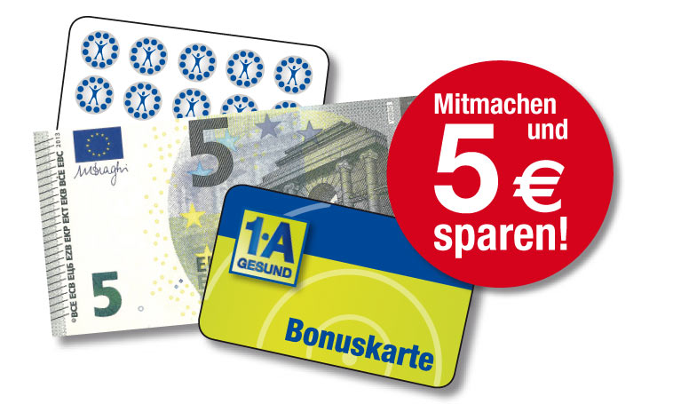 Jede volle Bonuskarte ist 5 EUR wert und kann beim nächsten Einkauf in Ihrer 1A-GESUND Apotheke eingelöst werden.